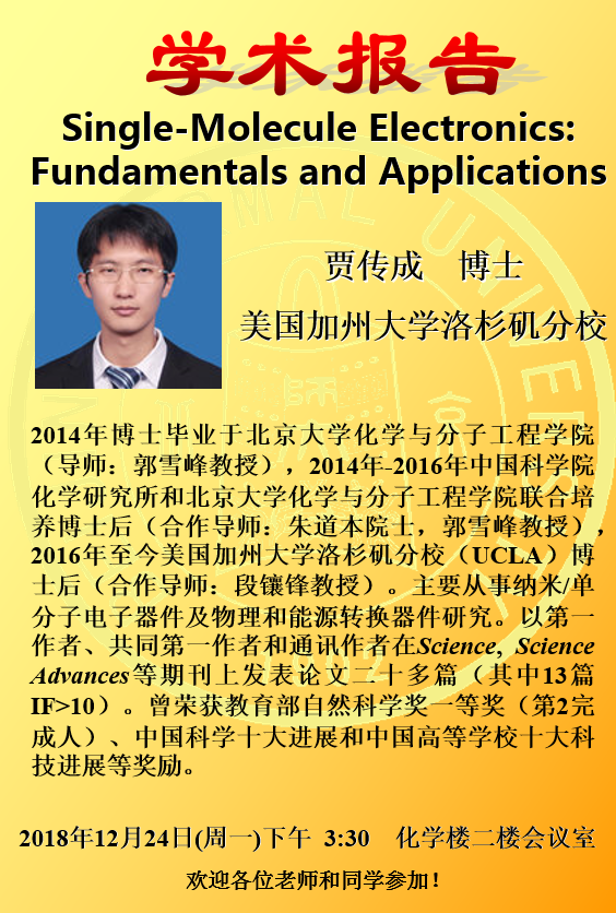 学术报告:美国加州大学洛杉矶分校,贾传成博士,Single-Molecule electronics:fundamentals and applications