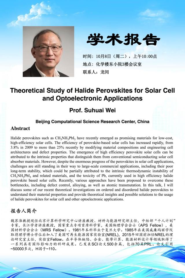 学术报告:北京计算科学研究中心,魏苏淮 教授,Theoretical Study of Halide Perovskites for Solar Cell and Optoelectronic Applications