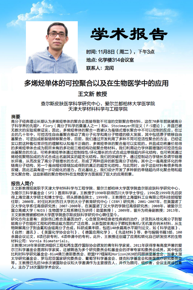学术报告:爱尔兰查尔斯皮肤医学科学研究中心都柏林大学医学院,王文新 教授,多烯烃单体的可控聚合以及在生物医学中的应用