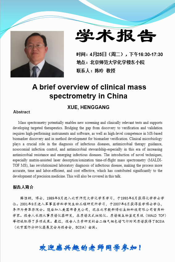 学术报告:北京毅新博创生物科技有限公司首席科学家,薛恒钢博士,A brief overview of clinical mass spectrometry in China