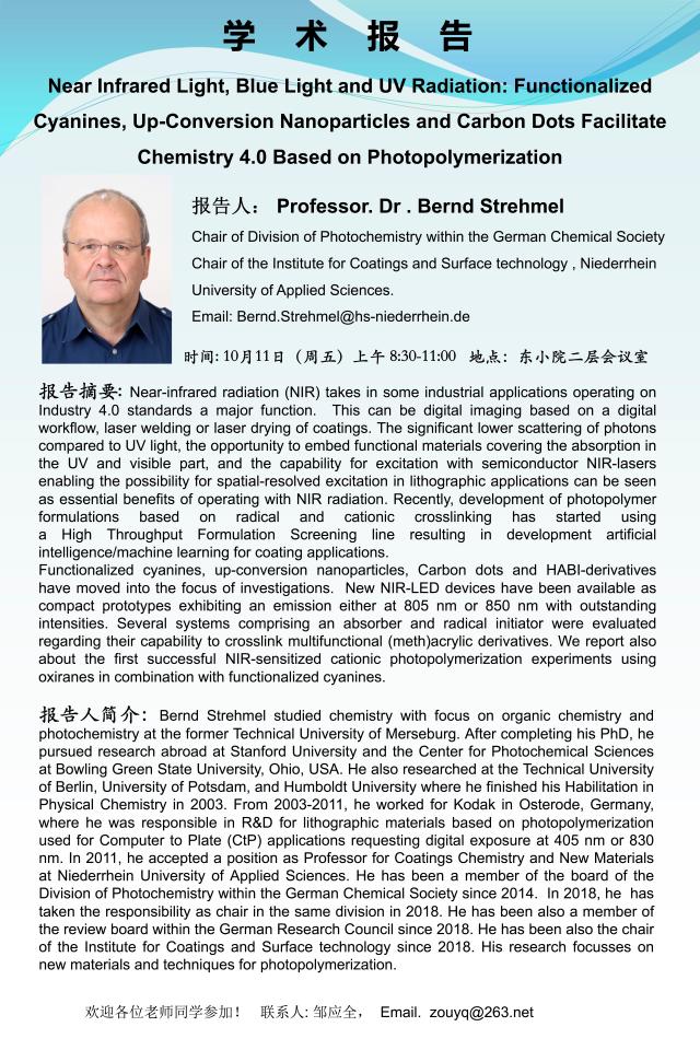 学术报告:Professor. Dr . Bernd Strehmel,Near Infrared Light, Blue Light and UV Radiation: Functionalized Cyanines, Up-Conversion Nanoparticles and Carbon Dots Facilitate Chemistry 4.0 Based on Photopolymerization