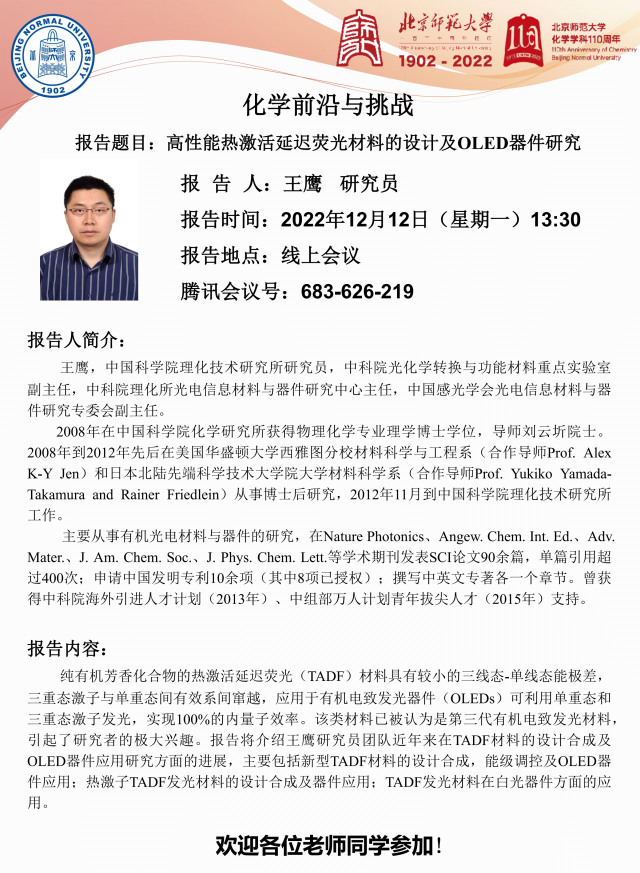 学术报告:中国科学院理化技术研究所,王鹰研究员,高性能热激活延迟荧光材料的设计及OLED器件研究