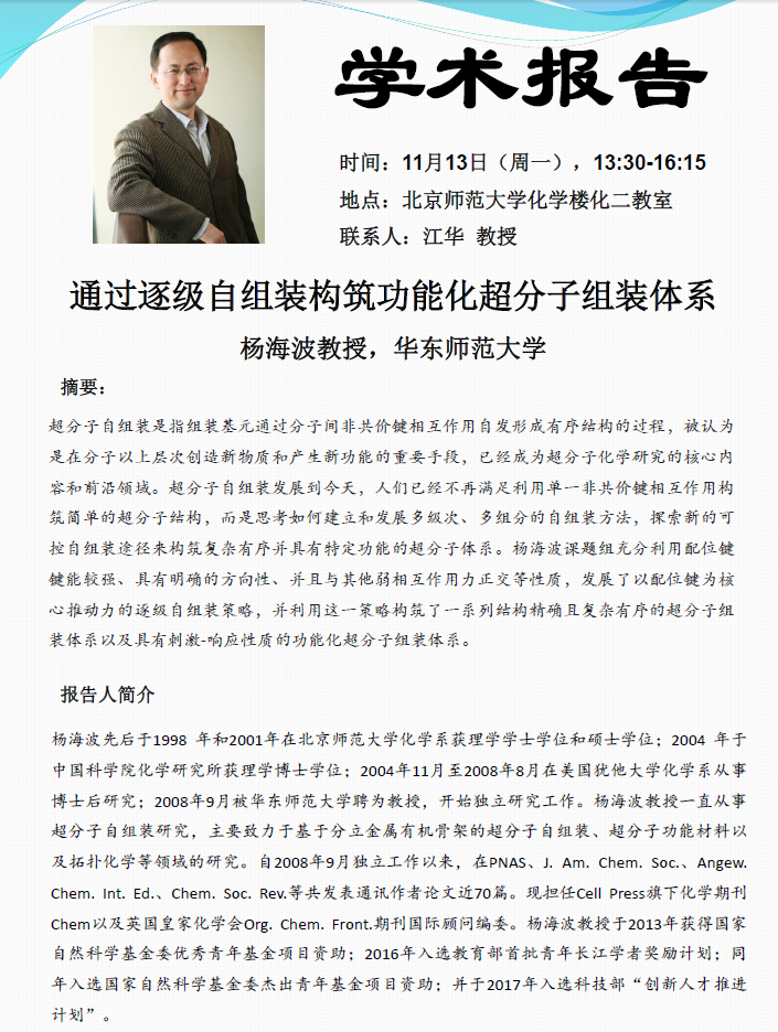 学术报告:华东师范大学,杨海波教授,通过逐级自组装构筑功能化超分子组装体系