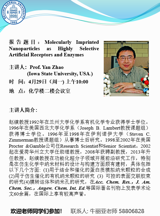 学术报告:Iowa State University, 赵縯教授,Molecularly Imprinted Nanoparticles as Highly Selective Artificial Receptors and Enzymes
