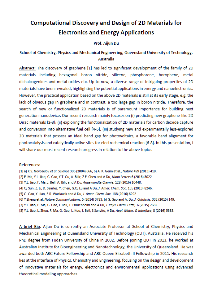 学术报告:Queensland University of Technology, Australia,Prof. Ai Jun Du,“Computational Discovery and Design of 2D Materials for Electronics and Energy Applications”