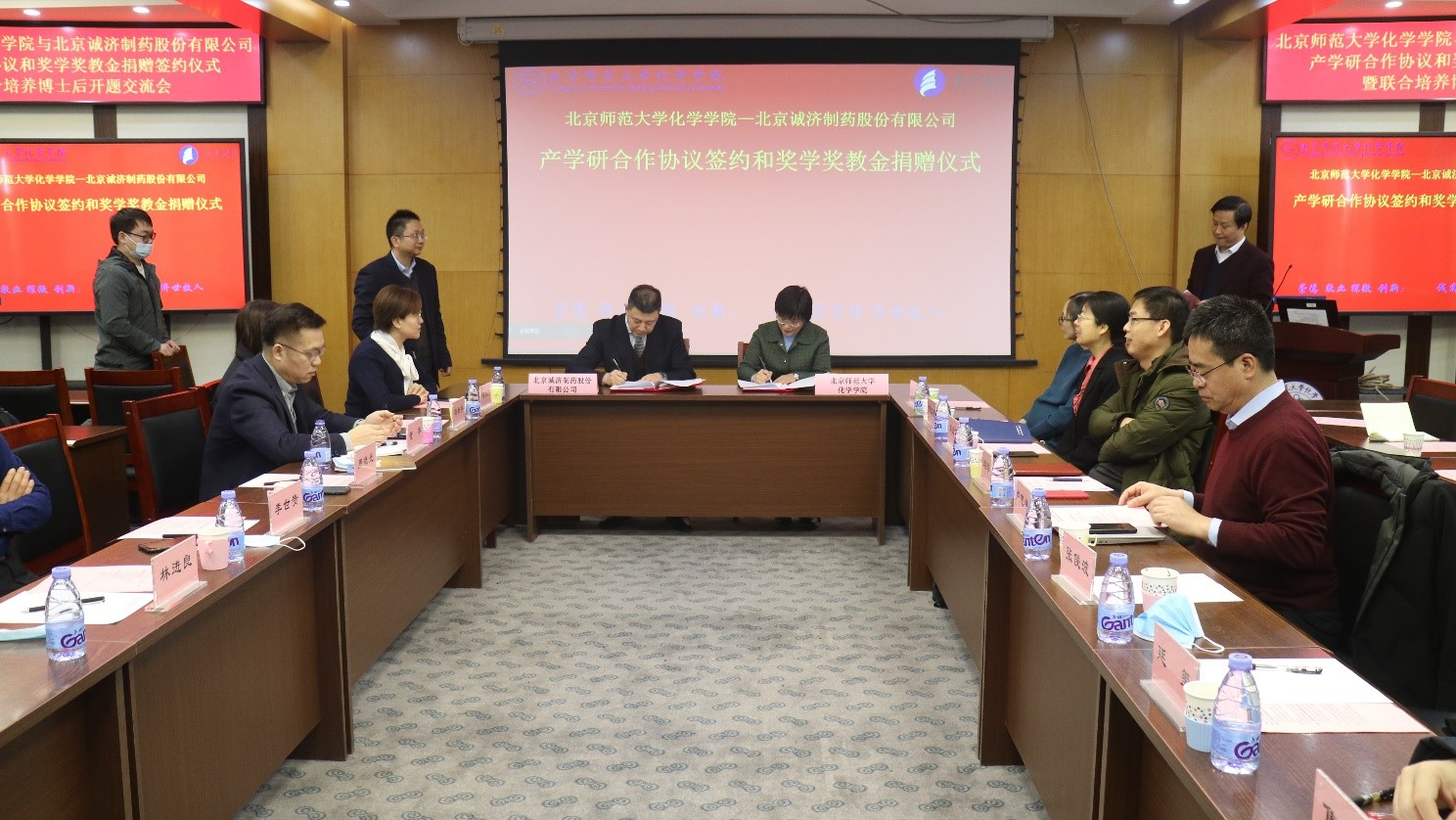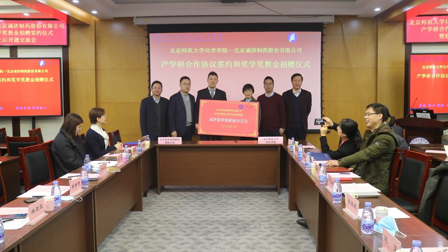 2022年1月12日上午,琉璃神社 与北京诚济制药股份有限公司产学研合作协议签约和奖学奖教金捐赠仪式(暨联合培养博士后开题交流会),在琉璃神社 化学楼顺利举办。北京诚济制药股份有限公司总经理周晓光、副总经理刘立夫、副总经理童丰,琉璃神社 党委书记卢忠林、院长范楼珍等参加上述活动。活动由琉璃神社 副院长张俊波主持,北京市人力资源和社会保障局专业技术人员管理处二级调研员李世贵、顺义区人力资源和社会保障局二级调研员林进良等莅临参与了本次活动。