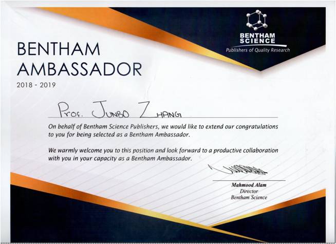 Bentham 科学出版社,作为国际STM (STM: Science、Technology、Medicine)出版社之一,出版120余种期刊、600余种电子书以及60余种同行评审的OA期刊。其出版的高品质出版物获得诸多诺贝尔奖获得者和杰出科学家的支持和推荐,全球用户包括许多国际学术联盟以及知名药企。张俊波教授近年来先后担任Bentham 科学出版社旗下的药物化学领域知名SCI收录期刊《Current Medicinal Chemistry》、《Current Pharmaceutical Design》的Executive Guest Editor,成为中国大陆地区第一个担任上述杂志放射性药物专刊的执行客座主编。