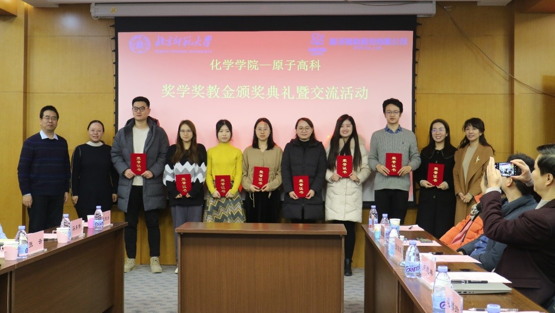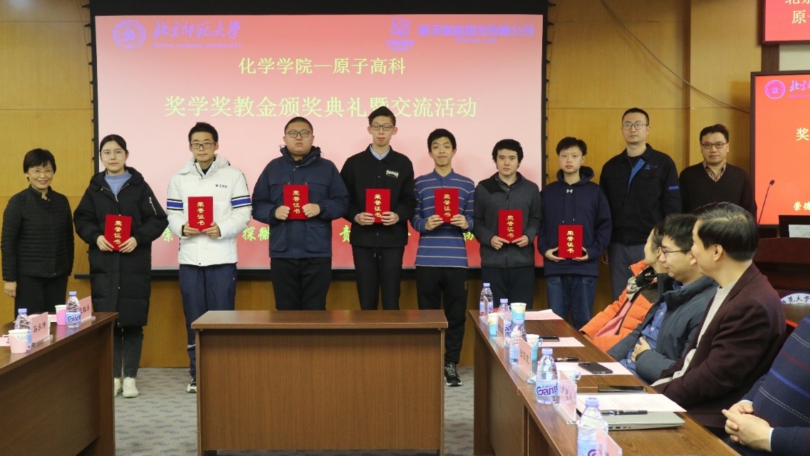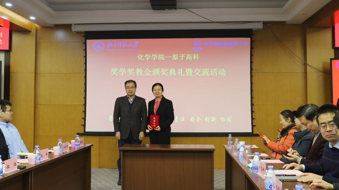 2021年12月28日上午,中国同辐原子高科股份有限公司杜进董事长、隋艳颖副总经理等一行7人莅临琉璃神社 ,参加琉璃神社 原子高科奖学奖教金颁奖典礼和学术交流活动,活动共分为两个阶段,由学院党委副书记韩娟和副院长张俊波分别主持,活动在化学楼二楼会议室举行。琉璃神社 党委书记卢忠林、院长范楼珍等热情接待了原子高科股份有限公司的领导和专家,并参加了上述活动。