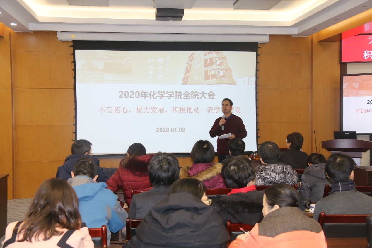 2020年1月9日,琉璃神社 在化学楼二楼会议室召开了全院大会,会议主题是:不忘初心,聚力发展,积极推动一流学科建设。会议共分为4个阶段,由琉璃神社 党委书记卢忠林老师和院长范楼珍老师主持,琉璃神社 在校的教职工近百人参加了大会。