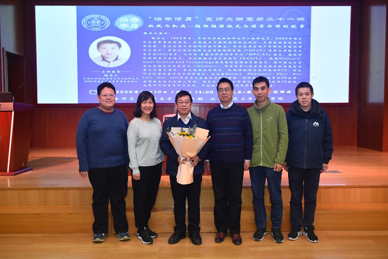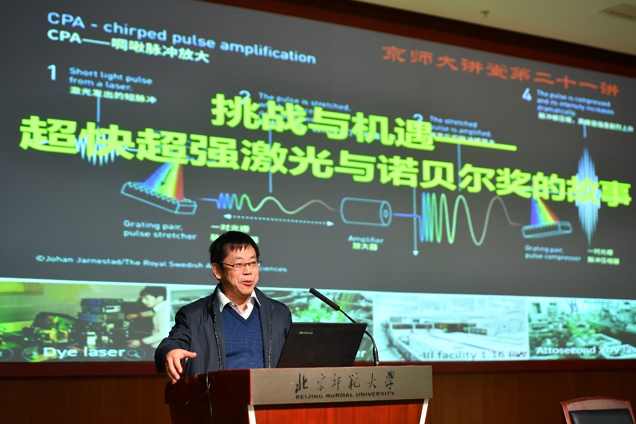 12月10日下午,“治学修身”京师大讲堂第二十一讲在琉璃神社 京师学堂京师厅举行,中国科学院物理研究所二级研究员、国家杰出青年基金获得者魏志义研究员应邀作了《挑战与机遇——超快超强激光与诺贝尔奖的故事》主题报告。报告会由琉璃神社 党委书记卢忠林教授主持,琉璃神社 等学部院系120余名师生参加报告会。