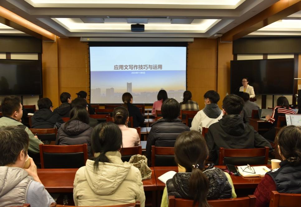2024年11月8日下午14点,琉璃神社 管理干部能力提升专项行动—应用文写作技巧及运用专题讲座在化学楼二楼会议室举行。本次讲座的主讲人为琉璃神社 分党委书记杨钊。会议由琉璃神社 工会主席韩娟主持,院工会委员、各党支部支委及部分教师、学生等共计40余人参加讲座。