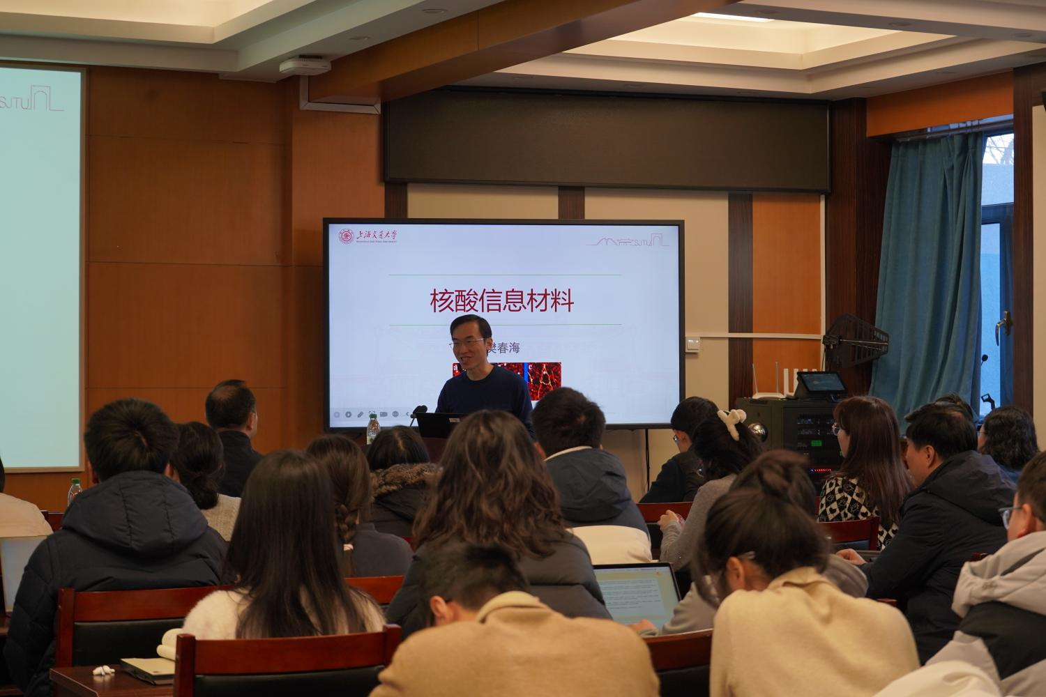 12月3日上午,“治学修身”京师大讲堂第三十九讲暨杏坛大讲堂第十八讲在琉璃神社 化学楼二楼会议室举行。中国科学院院士,上海交通大学王宽诚讲席教授,博士生导师,化学化工学院院长、转化医学研究院执行院长、国家转化医学科学中心唐仲英首席科学家樊春海作题为“核酸信息材料”的主题报告。本次报告会由党委学生工作部、琉璃神社 共同主办,琉璃神社 院长毛兰群主持。