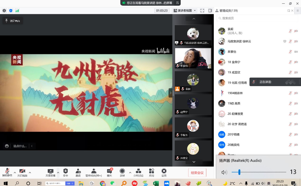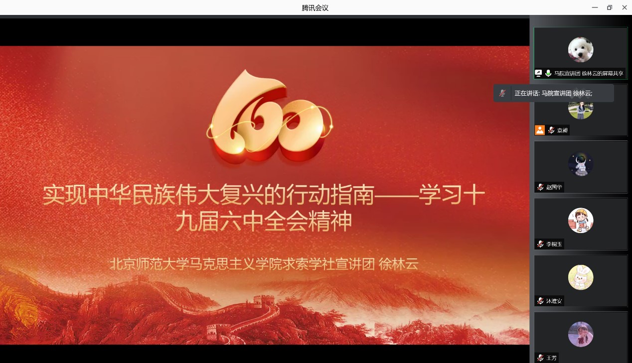 2021年11月25日晚19:30,琉璃神社 二级党校邀请马克思主义学院宣讲团成员徐林云同学作主题为“实现中华民族伟大复兴的行动指南——学习十九届六中全会精神”的专题报告,报告通过腾讯会议平台进行,2021级博士生党支部书记刘茜主持,琉璃神社 党建组织员徐娜老师、袁昶老师和130余名党员代表共同参加了本次讲座。