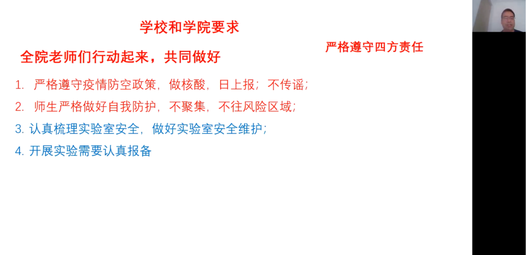 学院党委书记卢忠指出,北京市疫情形势严峻复杂,疫情风险离学校越来越近,已经传播至校园周边的多个点位,学校与疫情的较量正处于最关键的节点,全院教师务必提高政治站位,增强疫情防控工作的政治自觉、思想自觉和行动自觉,严格遵守四方责任,认真配合学校和学院的各项防疫工作安排,坚定信心、以身作则、积极行动,同时,将实验室安全工作落实落细,关注仪器设备的维护,杜绝安全事故,及时了解和回应学生需求和困难,加强对学生的思想引导、心理疏导、就业帮扶等工作,坚持“一边抗疫情,一边谋发展”提前做好相关工作预案,统筹规划教育教学和科学研究等工作。