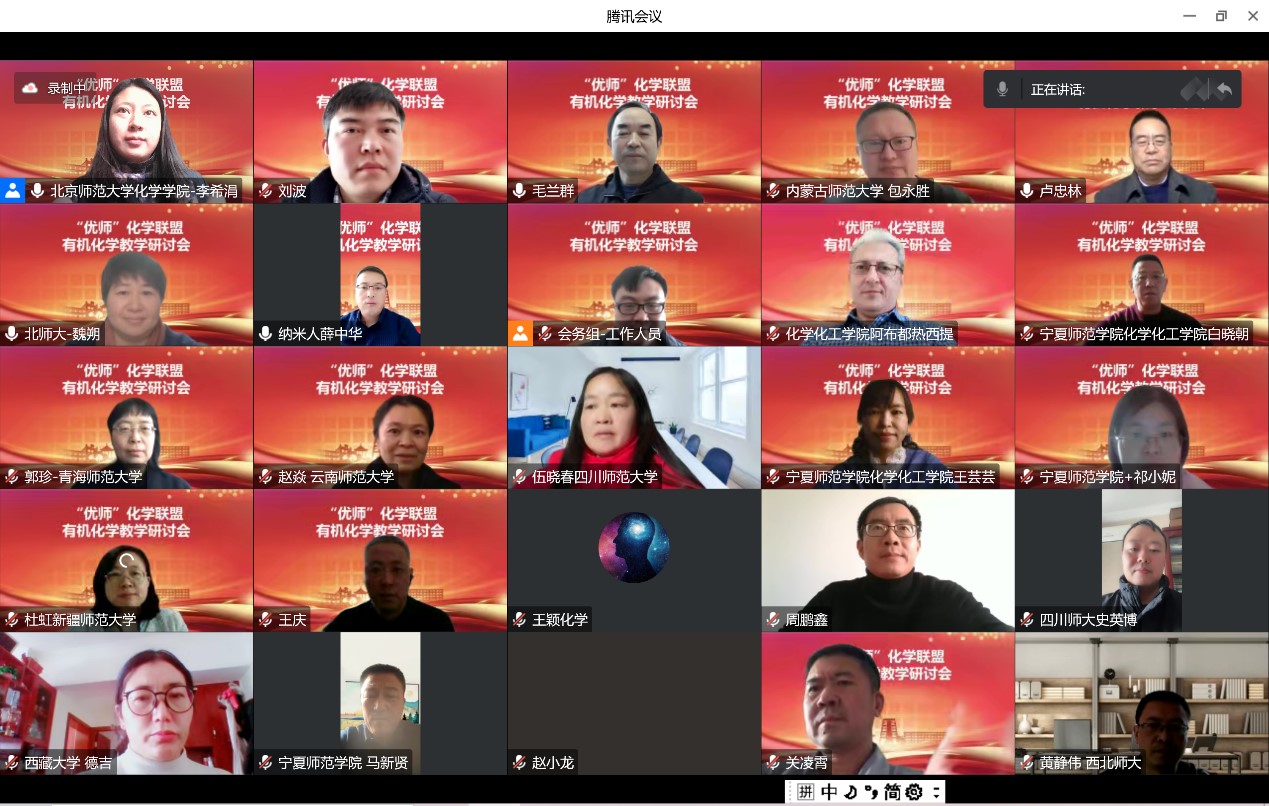 为深入贯彻习总书记“优师”回信精神、落实教育部办公厅 “关于进一步做好‘优师计划’师范生培养工作的通知” ,及时响应2023年全国教育工作会议精神,2023年1月17日下午,琉璃神社 组织多所师范院校化学学科代表在线上举行“优师”化学联盟有机化学教学线上研讨会。四川师范大学化学与材料科学学院、云南师范大学化学化工学院、宁夏师范大学化学化工学院、西北师范大学化学化工学院院、新疆师范大学化学化工学院、内蒙古师范大学化学与环境科学学院、云南大学化学科学与工程学院、青海师范大学化学化工学院、琉璃神社 及珠海校区化学系的党委书记、院长、教学副院长等60余位领导和老师参加会议。