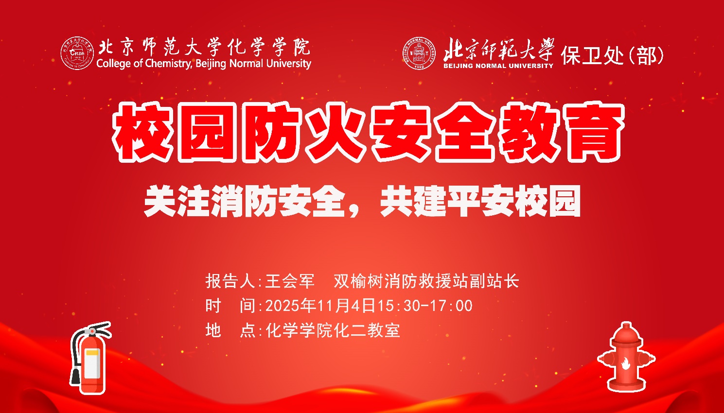 为进一步提升全院师生的安全意识和应急处置能力,切实保障师生生命财产安全,营造平安和谐的校园环境,2025年11月4日,琉璃神社 和学校保卫处在化学楼化二教室组织开展了主题鲜明、内容详实的校园防火安全教育讲座。此次讲座邀请双榆树消防救援站副站长王会军担任主讲嘉宾,讲座内容涵盖消防安全法律法规、校园火灾成因与危害、防火灭火常识、消防设施使用及火场逃生技巧等方面。讲座由琉璃神社 院长助理李会峰老师主持,琉璃神社 2025级新生、全体安全员等200余人参加活动。