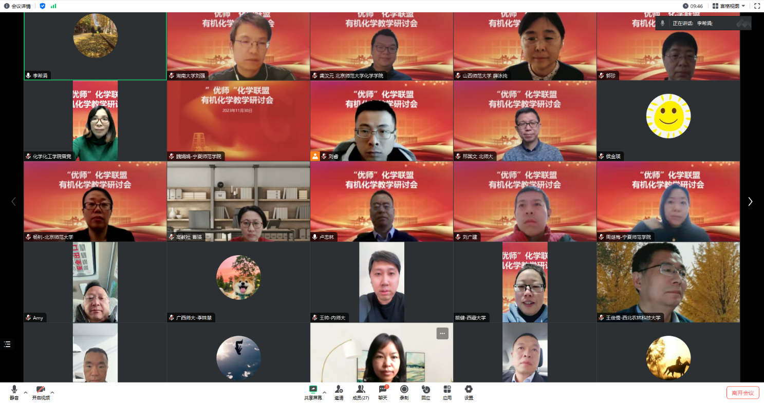 为深入探索“优师计划”化学人才培养规律,进一步提升有机化学教学质量,2023年11月30日,琉璃神社 琉璃神社 组织召开了第三期“优师”化学联盟有机化学教学线上研讨会,此次研讨会以数字化资源建设为主题。琉璃神社 、青海师范大学、内蒙古师范大学、四川师范大学、宁夏师范学院、山西师范大学、西北师范大学、新疆师范大学等多所师范院校有机化学教师代表参加此次研讨活动。