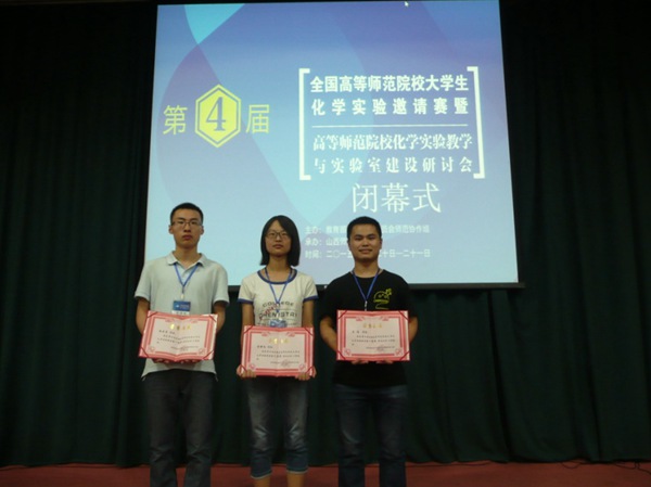 三名同学和三名教师参加了本次邀请赛和研讨会。三名学生分别参加了无机化学、有机化学和分析化学三个组别的比赛,王远同学和赵云星同学获得了一等奖、刘静远同学获得了三等奖。比赛取得的佳绩将激励我们继续加强化学实验教学改革,不断提高本科生的实践能力和科学素质。