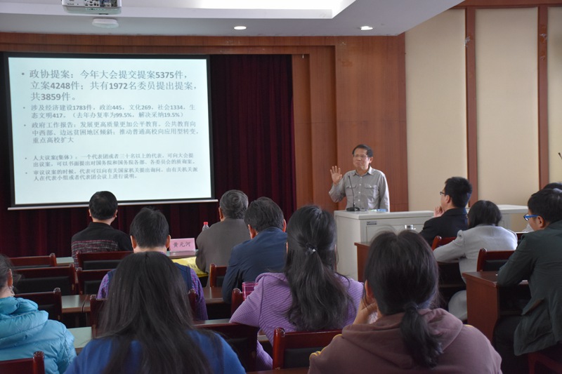 黄元河教授带来了有关两会精神的专题报告,用简明易懂的语言介绍了两会的基本情况,并选取了师生党员们关心的两会热点议题进行了讲解,而后跟大家分享了两会中有关于教育界的专题讨论,并强调建设“世界一流大学和一流学科”要兼顾整体,惠及地方高校和中西部高校。最后,黄元河教授还同在场师生分享了两会期间台前幕后作风转变,务实节约的新气象,针对师生党员们提出的问题耐心地予以解答。参会老师和同学们对两会精神有了更深刻的理解。
