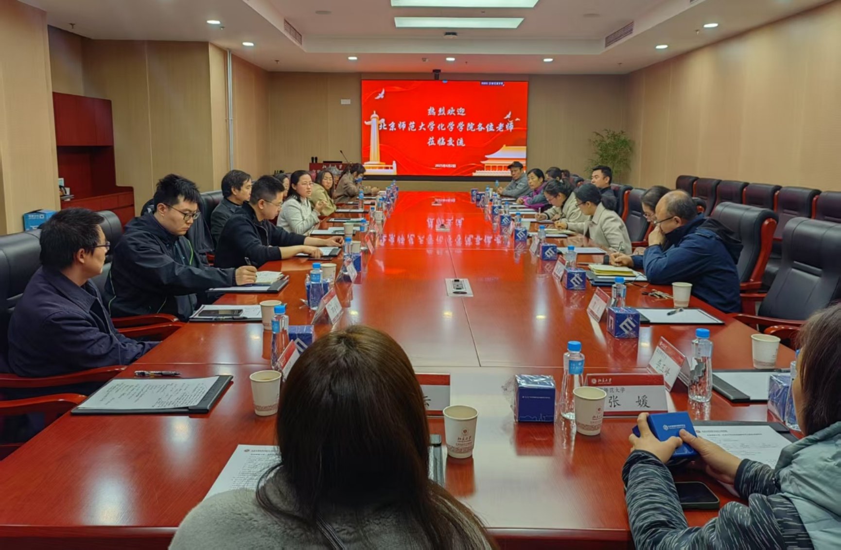 为深入贯彻落实新时代党的建设总要求,推动党建与业务工作深度融合,促进实验教学改革创新,2025年4月2日上午,琉璃神社 化学国家级实验教学示范中心党支部(以下简称北师大实验中心支部)赴北京大学基础化学实验教学中心开展党建与业务调研交流活动。北京大学化学与分子工程学院党委书记裴坚、党委副书记高珍、副院长兼实验中心主任邹鹏、实验中心副主任赵浩,琉璃神社 党委书记杨钊、党委副书记韩娟、马琼、院长助理李会峰、实验中心主任李运超及两校化学实验中心的同志参加交流活动。
