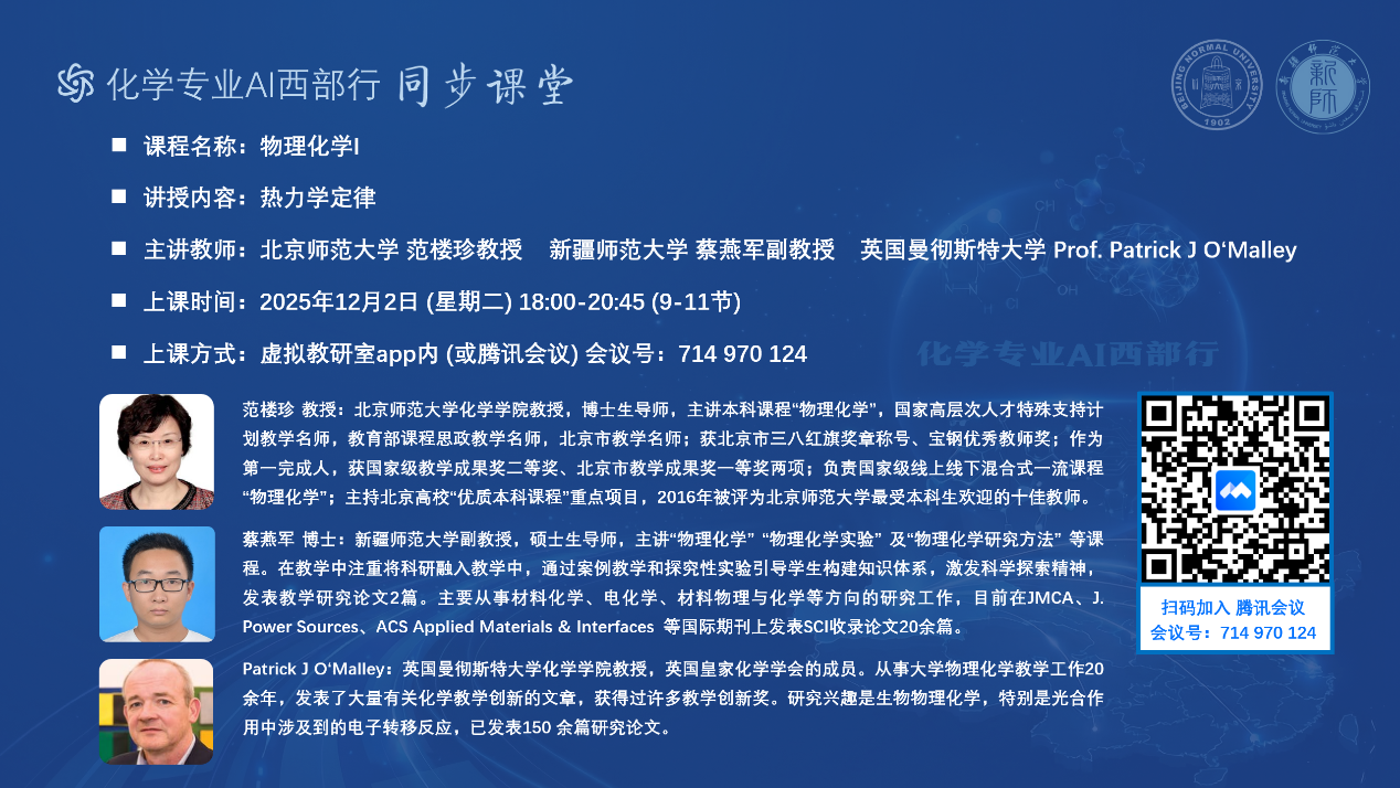 为深入推进教育部教育数字化战略行动,持续提升师范院校物理化学课程教学质量,2025年12月2日,一场跨越数千公里的“云端”相聚在琉璃神社 与新疆师范大学同步开启。琉璃神社 范楼珍教授团队联合新疆师范大学蔡燕军副教授团队,依托最新建设的“物理化学”智慧课程平台,成功开展了基于“化学专业AI西部行”计划的同步课堂教学活动,实现了智慧化、国际化与跨区域协同育人的深度融合。