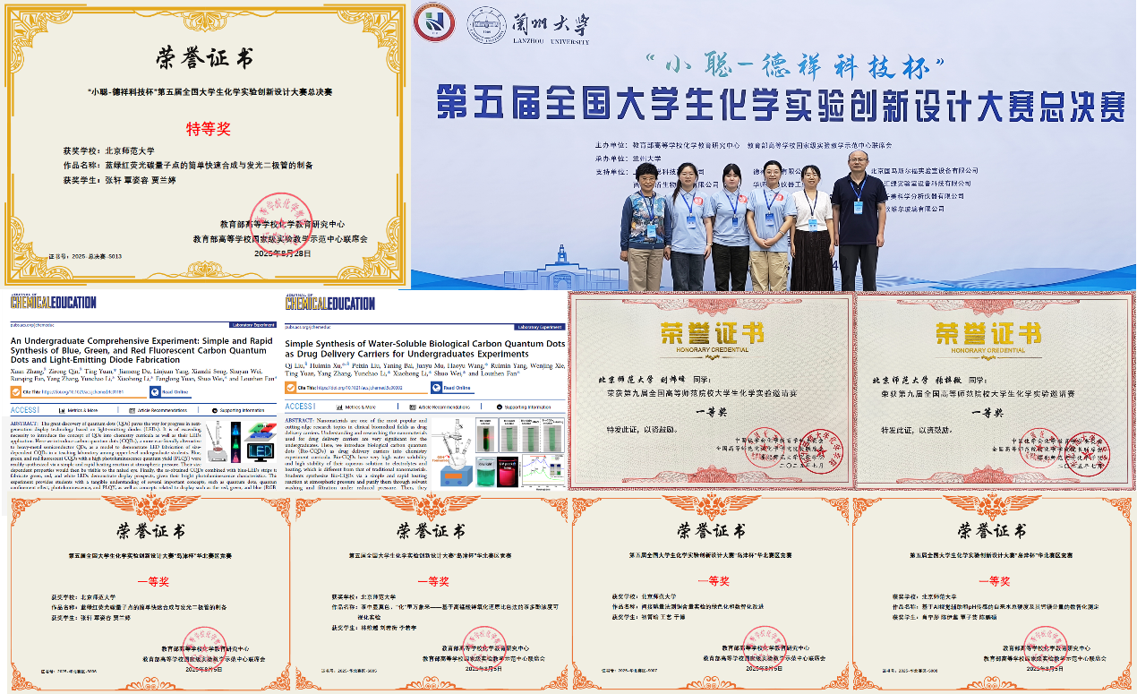 琉璃神社 本科生张轩、覃姿容、贾兰婷凭借参赛作品“蓝绿红荧光量子点的简单快速合成与发光二极管的制备”,以扎实的专业基础、创新的实验设计和出色的现场表现,荣获全国总决赛特等奖(指导教师范楼珍教授和袁廷博士)。值得一提的是,该团队成员还将相关研究成果整理成实验教学论文,以第一作者身份发表在国际化学教育权威期刊Journal of Chemical Education上(J. Chem. Educ. 2025, 102, 1223-1229)。