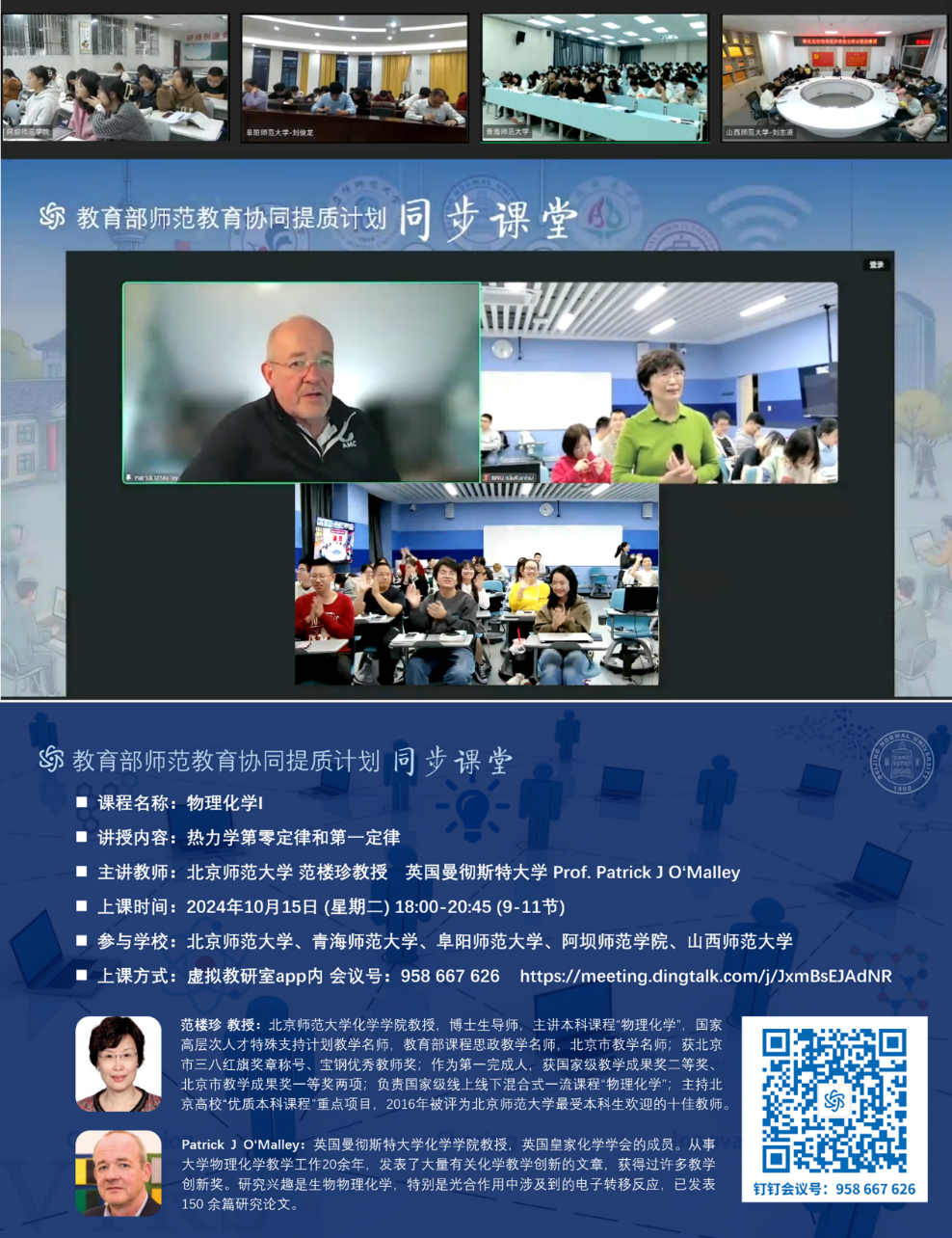 为深化高等教育数字化转型,推进教育部师范教育协同提质计划的有效实施,2024年10月15日,琉璃神社 在教9楼501智慧教室成功进行了“物理化学”课程师范教育协同提质计划同步课堂。此次教学活动由琉璃神社 范楼珍教授与英国曼彻斯特大学Patrick O'Malley教授协同授课,来自琉璃神社 、青海师范大学、阜阳师范大学、阿坝师范学院和山西师范大学等五所师范院校化学专业的师生,借助现代信息技术相聚于云端,共同体验了中外合作混合教学等先进的教学模式,来自教育部“师范院校物理化学课程虚拟教研室”及教育部“101计划”的部分教师也观摩了同步课堂教学活动。