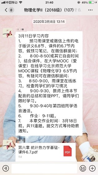 2020年新春伊始,一场突如其来的疫情打破了常规的课程计划。为响应学校提出的“延期开学不停课,多元教学保质量”的倡议,琉璃神社 “物理化学”教学团队经过精心部署与准备,于2月24日如期开始2019-2020学年春季学期“物理化学Ⅱ”的远程在线授课。物理化学课程因涉及较多的物理概念和数学推导,被学生认为是最难的一门专业必修课,为了调动学生的学习热情知难而上、并达到传统课堂的学习效果,教师团队综合设计了包括课前预习、课上观看MOOC视频、实时在线练习、教师答疑、课后反思提问等多环节和活动的复合式教学方案,并借助中国大学MOOC、长江雨课堂、微信群等多个网络平台与工具,探索了以MOOC授课为基础、以学生学习为中心、以教师辅导为支撑的物理化学远程教学。以难中之难的“统计热力学”为开篇章节,三周的教学实践表明,这种教学方式能够激发学生主动学习的兴趣,培养学生的自学能力,提高学生的思辨和创新能力。