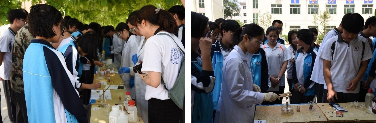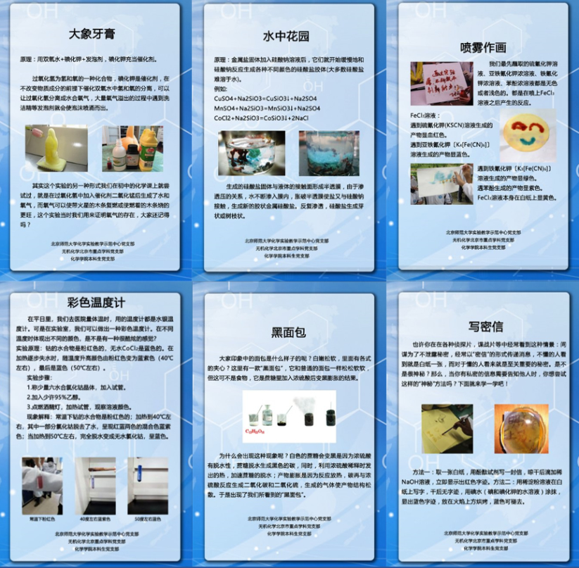 琉璃神社 本科生党支部的同学们还结合化学专业特色,在容城中学教学楼前进行了“水中花园”、“大象牙膏”、“喷雾作画”、“彩色温度计”、“黑面包”、“写密信”等多项趣味化学实验展示,这些实验项目受到了中学生们的喜爱,学生之间也通过生动活泼的形式进行了化学科普的交流与讨论,激发了中学生学习钻研化学的兴趣。