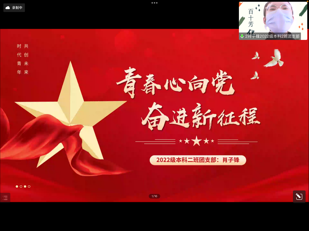 舞青年之霓虹,醉华夏之流觞。22级本科2班团支部的肖子锋同学以“青春心向党,奋进新征程”为主题,讲述了从马克思主义传入中国起,中国共青团奋斗救国,救亡图存的成长史。肖子锋同学在演讲中语速流畅,用清晰的逻辑线条回顾历史,展望未来,充分展现建团百年历史,号召同学们把握时代脉搏,不负韶华不负己。吾辈生在红旗下,长在春风里,应以积极进取的姿态擘画人生蓝图,寄人生以华枝春满,予岁月以葳蕤春潮!