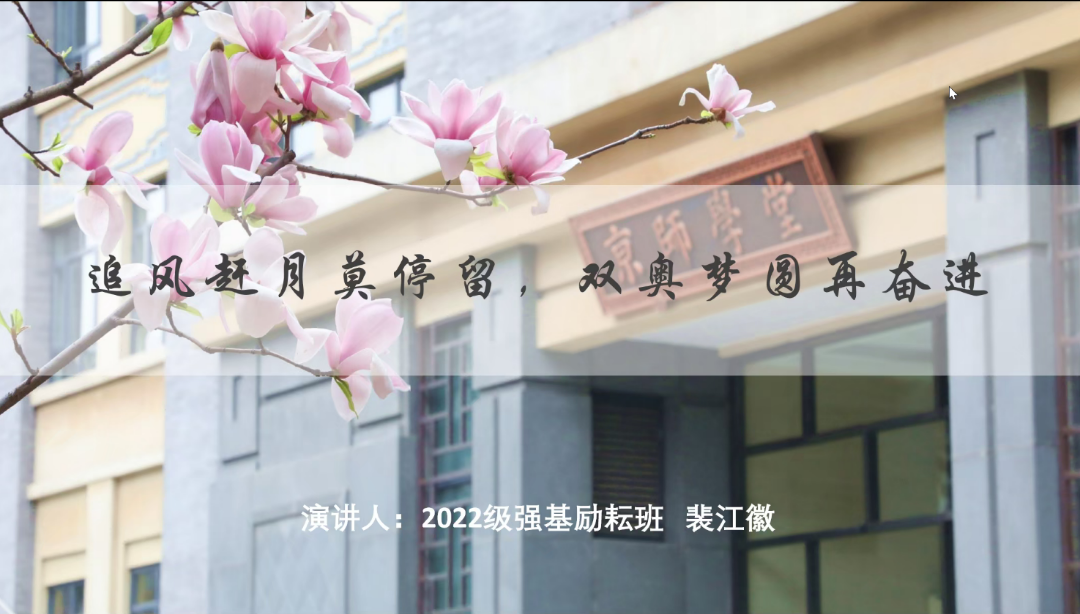 少年何妨梦摘星,敢挽桑弓射玉衡。22级本科大类1班团支部的郭禹伯同学以“争做时代新人,不负党和人民”为主题展开演讲,郭禹伯同学以习总书记考察中国人民大学为切入点,忆往昔岁月,李大钊先生以其青春热忱柔化地球之白首;看今朝盛世,新时代青年以其笃实坚定担当家国之责任。在演讲中郭禹伯同学用铿锵的语调,昂扬的姿态展现了历史使命薪火相传,代代青年初心不改,让同学们明白作为新时代青年要潜心治学,以奋斗驱萧索,谱时代之华章!