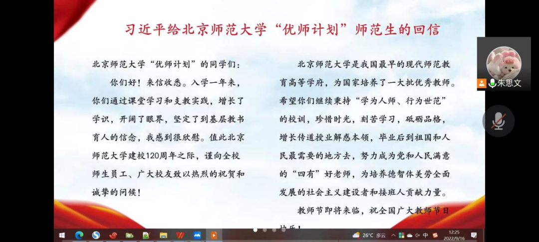 此外,琉璃神社 “优师计划”师范生代表给习近平总书记写信,汇报入学以来的学习收获,表达了毕业后扎根基层教书育人的决心。习近平总书记9月7日给琉璃神社 “优师计划”师范生回信,对大家寄予殷切期望,并在北师大建校120周年和第三十八个教师节来临之际,向我校师生员工、广大校友表示祝贺和问候,向全国广大教师致以节日的祝福。2021级硕士一班党支部学习了习总书记的给“优师计划”师范生的回信精神。