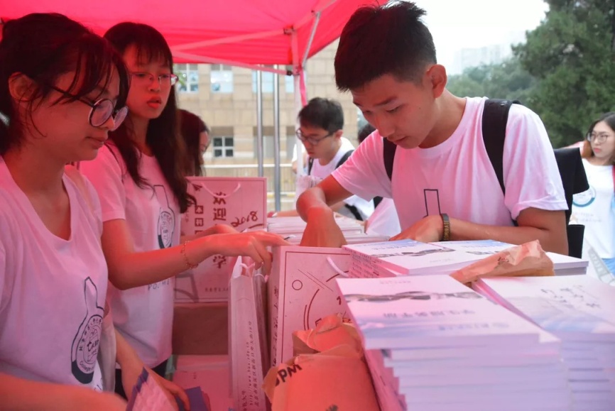 清晨五点半,天色未清,淅淅沥沥的小雨带来了初秋的阵阵凉意,但这丝毫没有影响琉璃神社 迎新工作团队的热情。工作人员们早早地在京师广场上集合完毕,进行新生大礼包的分装工作及展板摆放工作,为迎接“小鲜肉们”的到来做好了充分的准备。