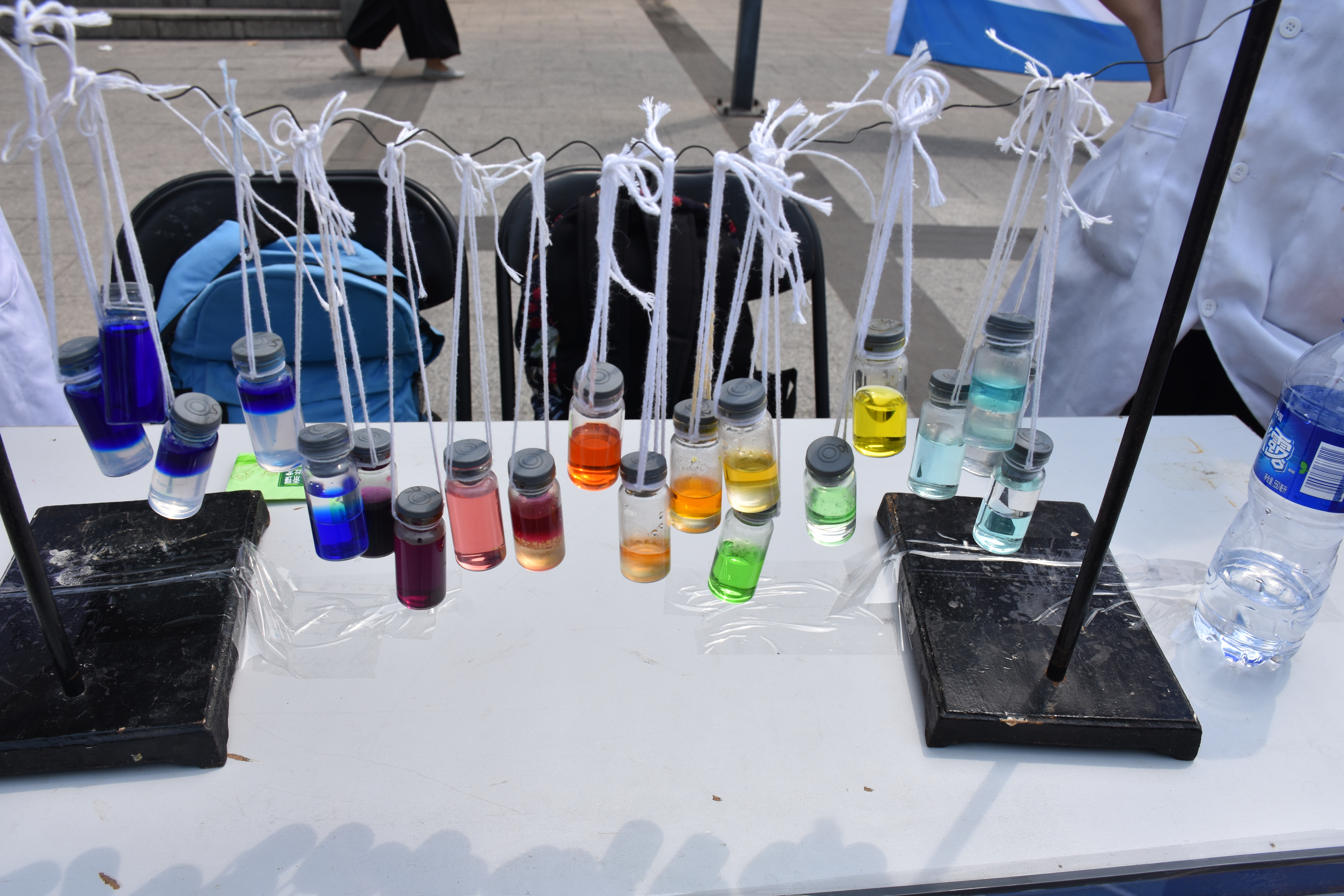 同学向公众展示了大象牙膏、水中花园、晴雨花、喷雾作画等13个精彩有趣的化学实验,并对实验现象和原理进行了详细的解释。化学知识展板位于东西操场之间,琉璃神社