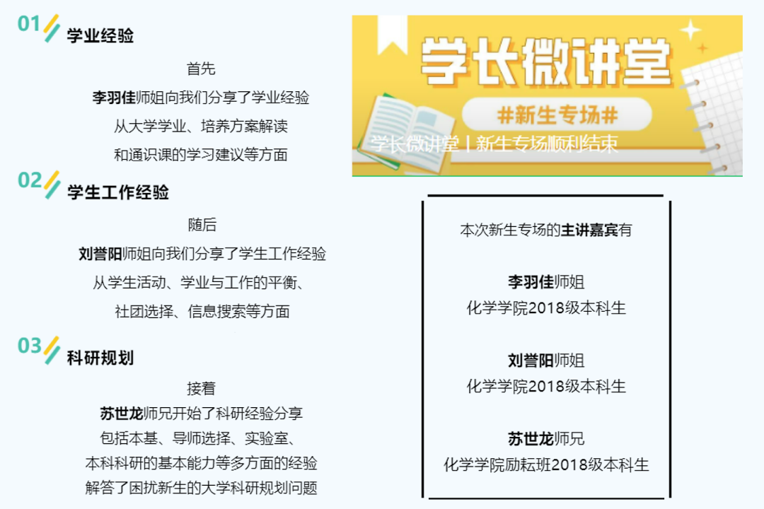 为了让新生们对未来的大学生活有更加明确的规划,2021年10月1日琉璃神社 学生会举办了“学长微讲堂”系列活动——新生专场,会上邀请了李羽佳师姐、刘誉阳师姐、苏世龙师兄,师兄师姐们从自身经历出发分享了学习、工作和科研的经验。