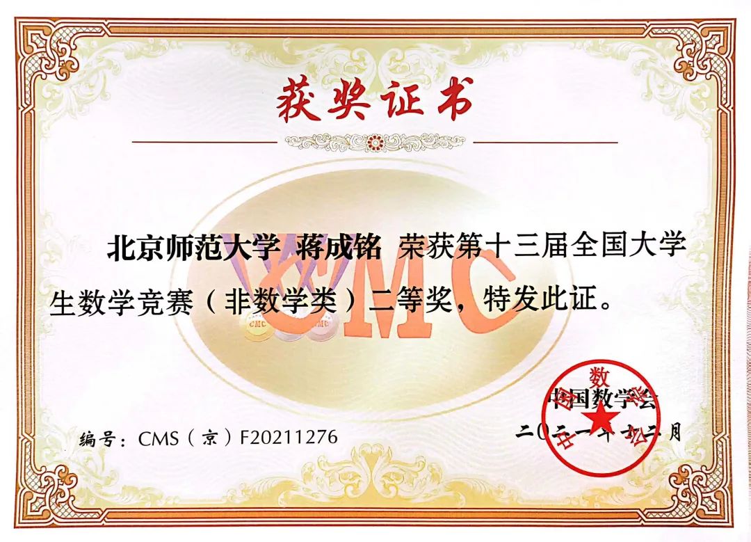 谈及关于参加数学竞赛的原因,蒋成铭坦言道,其实是因为自己不是很擅长数学,想要通过数学竞赛挑战自己,提高自己的在数学方面的能力。于是她抱着尝试的心态参加,付出最大的努力准备。最终她也取得了二等奖的好成绩。说到这个,蒋成铭也鼓励我们也可以积极参加各种竞赛,通过这种方式挑战自己,拓展自己的能力边界,充实自己的学习生活。“‘逼’自己一把,挑战一下自己。”蒋成铭笑着这么说。