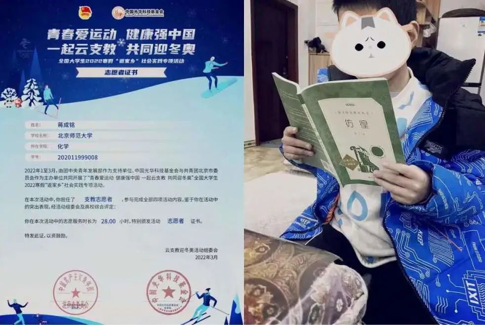 而支教是蒋成铭一直想做的事情,作为一名师大的学生,她更认为自己有责任参加。蒋成铭先后参加了“修水开源”暑假支教和“强师冬奥 一起云支教”。其中,令她印象深刻是暑假在江西省散原中学支教时结识的一位初三同学。“现在他还会时不时来问我一些问题,跟他们交流真的让我打开了新天地,感觉非常开心。”