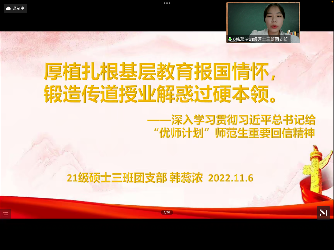 围绕“腾飞青春献礼二十大,木铎师化喜迎百拾诞”主题,各支部的选手们以讲团课的形式,结合实际对相关时政主题进行深入解读,代表相应支部展示各自的学习成果。各位嘉宾和同学们在线上进行观看。