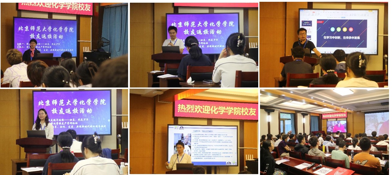 第三阶段有三项活动平行进行。秩年校友到邱季端体育馆参加学校秩年校友返校纪念大会;部分校友参观校史馆;部分校友在化学楼二楼会议室为在校生开展分享和宣讲活动。北京师范大学校长马骏、副校长周作宇、校友总会副会长陈光巨、琉璃神社 党委书记卢忠林等出席秩年返校纪念大会,马骏校长代表学校致辞,欢迎校友们回家,介绍学校近年来发展情况;校友总会组织师生校友代表开展了诗朗诵《师大和你》,四重唱《相逢是首歌》等,制作了秩年微电影与老照片展览。学院党委副书记韩娟主持校友分享和宣讲活动,50余名在校生聆听了校友代表的精彩分享。中国医学院科学院药物研究所副所长黄海洪校友、转化医学国家重大科技基础设施(北京协和)诊疗新技术研发转化平台主任张现忠校友、柳州高级中学教师覃睿校友、北京理工大学在读博士李玮昱校友、威海晨源分子新材料有限公司创始人兼总经理李武松校友介绍了自己的成长经历和工作领域,分享了工作心得和创业心得,寄语同学们要树立崇高理想,勇于创新、勇于坚持,努力学习,服务社会。