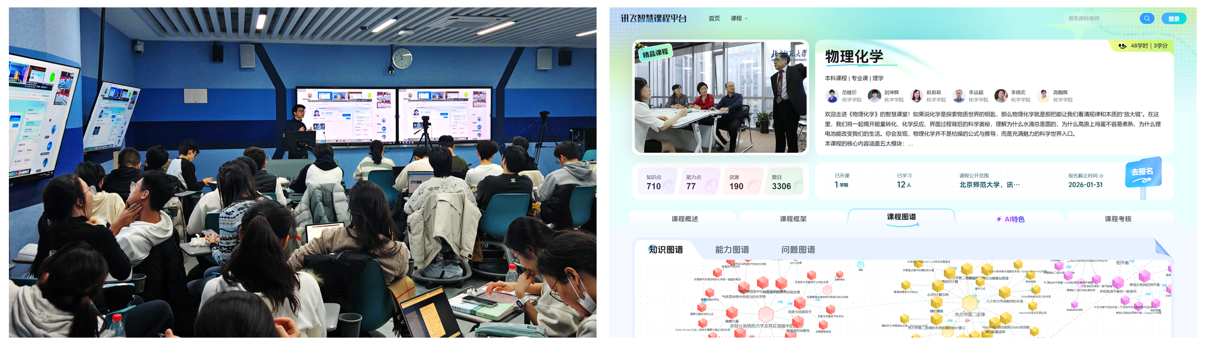 本次同步课堂依托琉璃神社 在科大讯飞平台建设的“物理化学”智慧课程。该课程集成了慕课视频、电子教案、全景式知识图谱、AI助教及智能批改等前沿模块的智能化教学空间,以“教、学、管、评、测”一体化的方式支撑课程的跨校共享与混合式教学,被平台推选为院校精品课程。同步课堂前,琉璃神社 范楼珍、刘坤辉老师与新疆师范大学蔡燕军老师依托智慧平台开展协同备课。通过平台数据,双方教师精准掌握了学生的预习情况,共同研讨教学设计,确定翻转课堂展示主题,实现了“跨区域同备一堂课”,为课堂的顺利实施奠定坚实基础。学生在预习阶段遇到的疑难问题,通过基于课程知识库的AI助教得到了实时专业的解答。基于共建共享的智慧课程,琉璃神社 作为“化学专业AI西部行”项目参与高校,使课堂从传统的单向知识传递,逐步转向高互动、高参与、数据驱动的智慧教学形态,为多校协同开课提供了可复制经验。